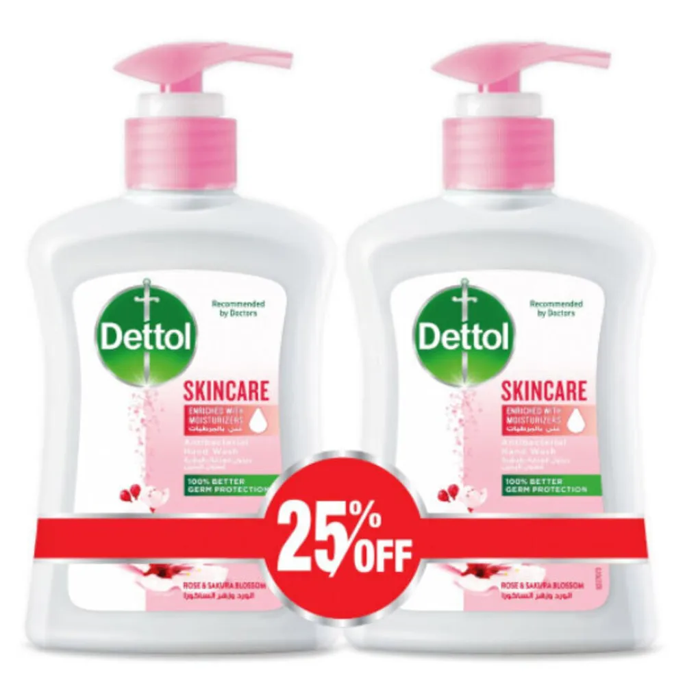 غسول يدين ديتول بعناية الجلد والورد وزهرة الساكورا 200 مل عبوتين عرض يساعد على تنظيف اليدين بلطف مع رائحة زهرية مميزة ولمسة ناعمة على البشرة كما يعد خيارًا اقتصاديًا للاستخدام اليومي المتكرر