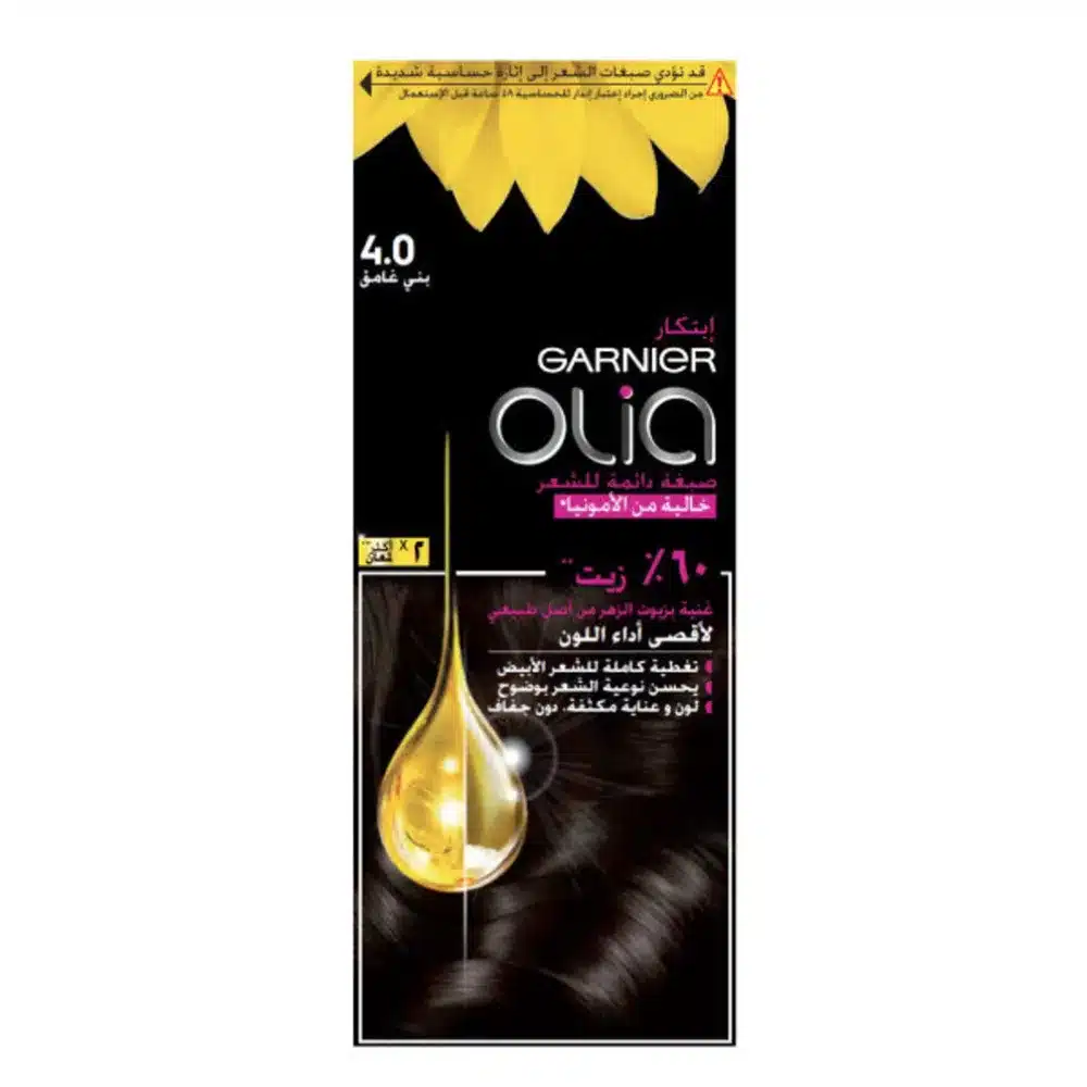 صبغة شعر غارنييه أوليا بني غامق 40 خالية من الأمونيا تمنح لونًا غنيًا وثابتًا مع تغطية فعالة للشيب وتساعد على الحفاظ على نعومة الشعر ولمعانه بفضل تركيبتها المغذية أثناء الصبغة