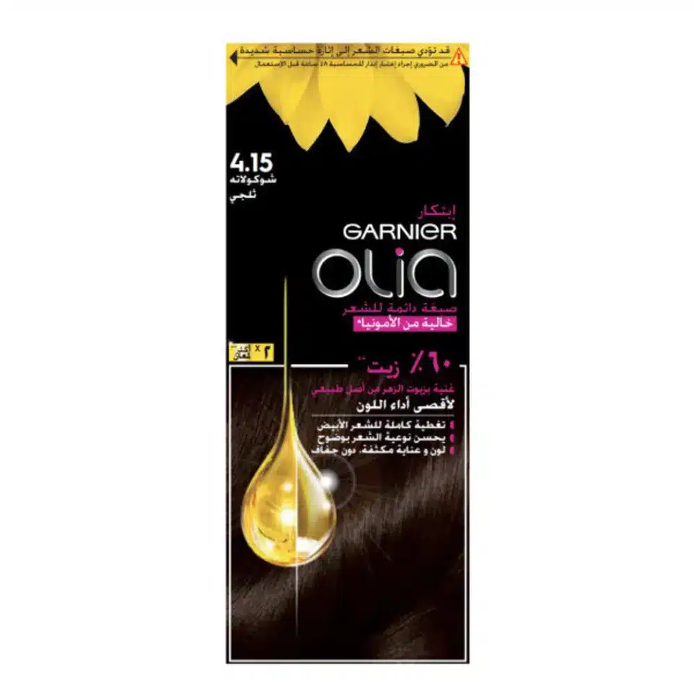صبغة غارنييه أوليا 415 شوكولاتة ثلجي تمنح الشعر لونًا بنيًا شوكولاتيًا بلمسة باردة أنيقة ولمعة واضحة مع تركيبة خالية من الأمونيا مناسبة للحصول على لون مميز وشعر بمظهر متجدد وجذاب