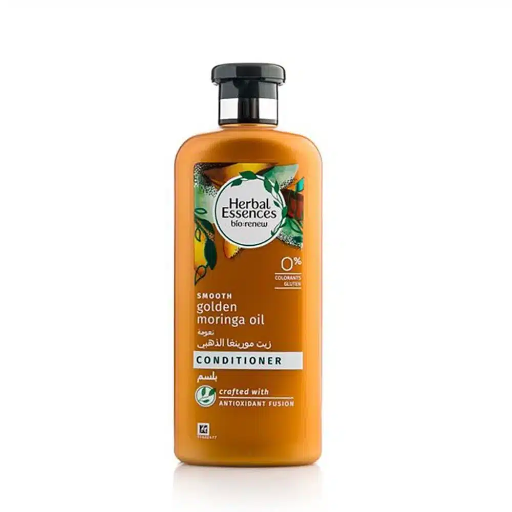 بلسم هيربال إيسنز بزيت المورينجا الذهبي 400 مل يساعد على تنعيم الشعر ومنحه انسيابية أفضل وتقليل الهيشان كما يترك الخصلات أكثر نعومة ولمعانًا مناسب للشعر الجاف أو الباهت وللاستخدام المنتظم بعد الشامبو